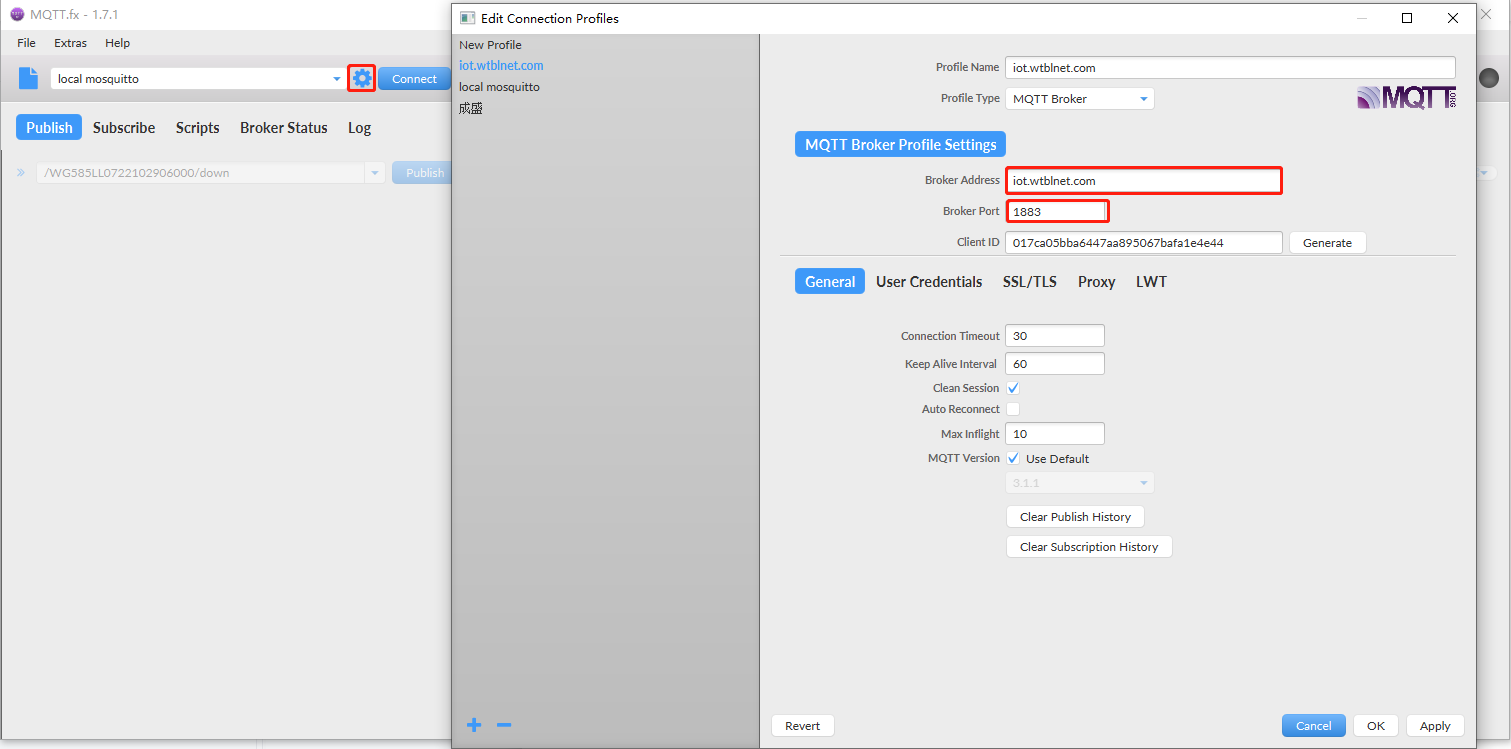 电脑安装“mqtt.fx”客户端,设置服务器地址和端口。