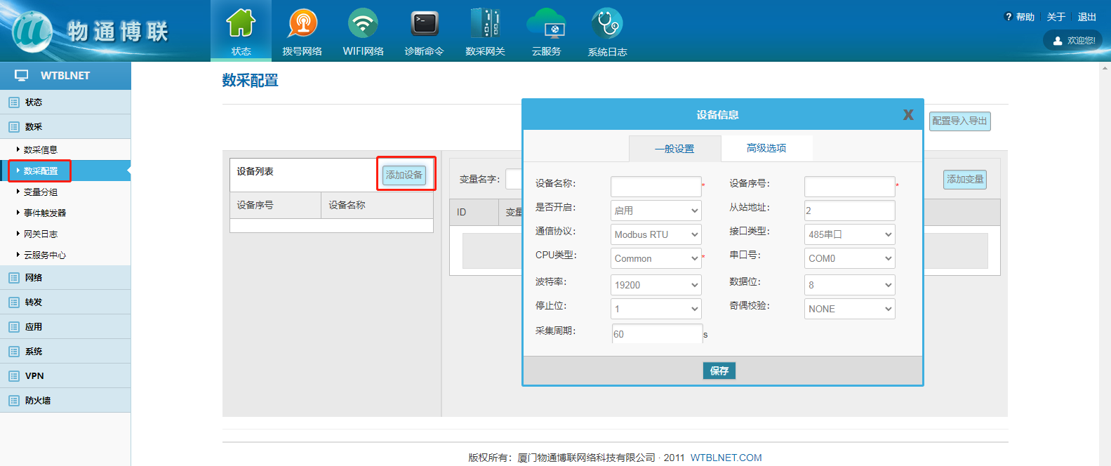 添加设备:设备名称和设备序号可以自定义,从站地址、通讯协议和通讯参数根据设备实际参数进行配置,最后保存。