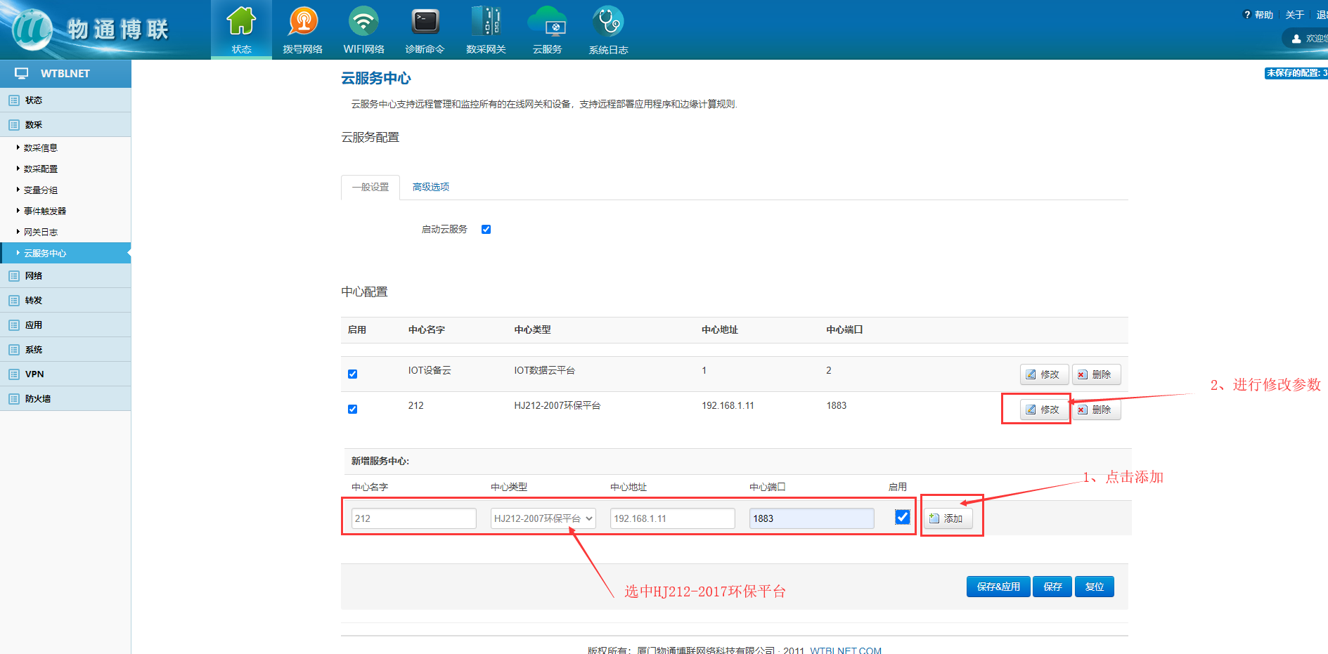 在数采→云服务中心,先添加对应类型的云中心,中心名称可自定义,中心地址、中心端口根据实际填写。