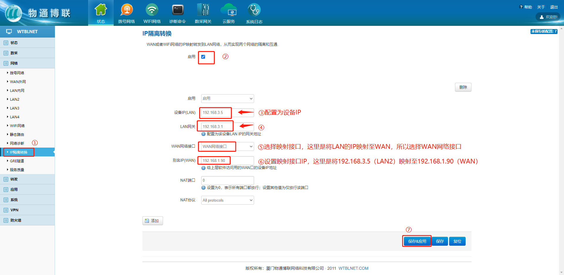 此处举例PLC(IP:192.168.3.5)连接网关LAN口(IP:192.168.3.1),并将PLC的IP映射至网络隔离器WAN口(IP:192.168.1.90),上位机(IP:192.168.1.8)即可顺利获得隔离器WAN口访问至位于隔离器LAN口的PLC。