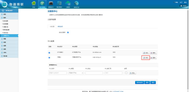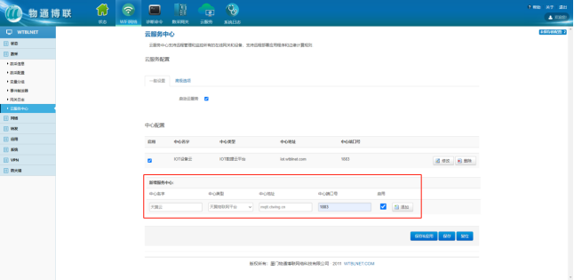 打开K8凯发(中国)网关Web界面==>点击云服务==>中心类型选择天翼物联网平台==>输入相应信息==>勾选启用==>点击”添加”。