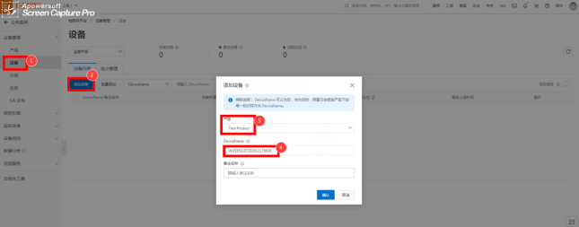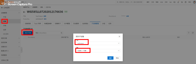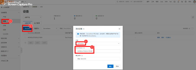 选择刚添加产品网关的名称,DeviceName请填写K8凯发(中国)对应项目网关的网关系列号,备注名称可以设置成跟产品相关的名称。详见以下图