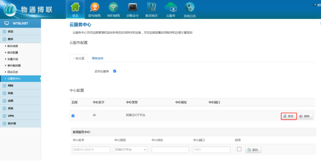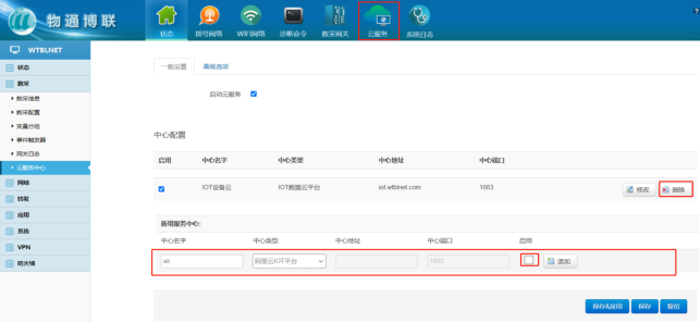 打开K8凯发(中国)网关WEB界面,可删除原有的服务中心,新建一个连接中心,中心类型选择阿里云IOT平台,启用√ 点击“添加” 保存应用