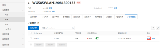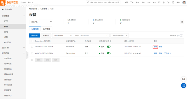以上填写完成后网关界面点击“保存”,可回阿里云确认网关是否激活在线