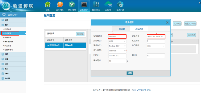 返回网关WEB界面,网关数采配置界面“添加设备”的数据参数。这边模拟采集数据用modbus slave模拟工具进行采集,也能用PLC进行采集。