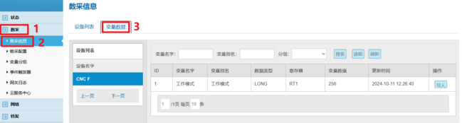 数采配置(设备信息+变量参数)完成后,重启采集程序并生效配置即可在:数采信息---变量数据---设备名称 中看到采集上来的数据。