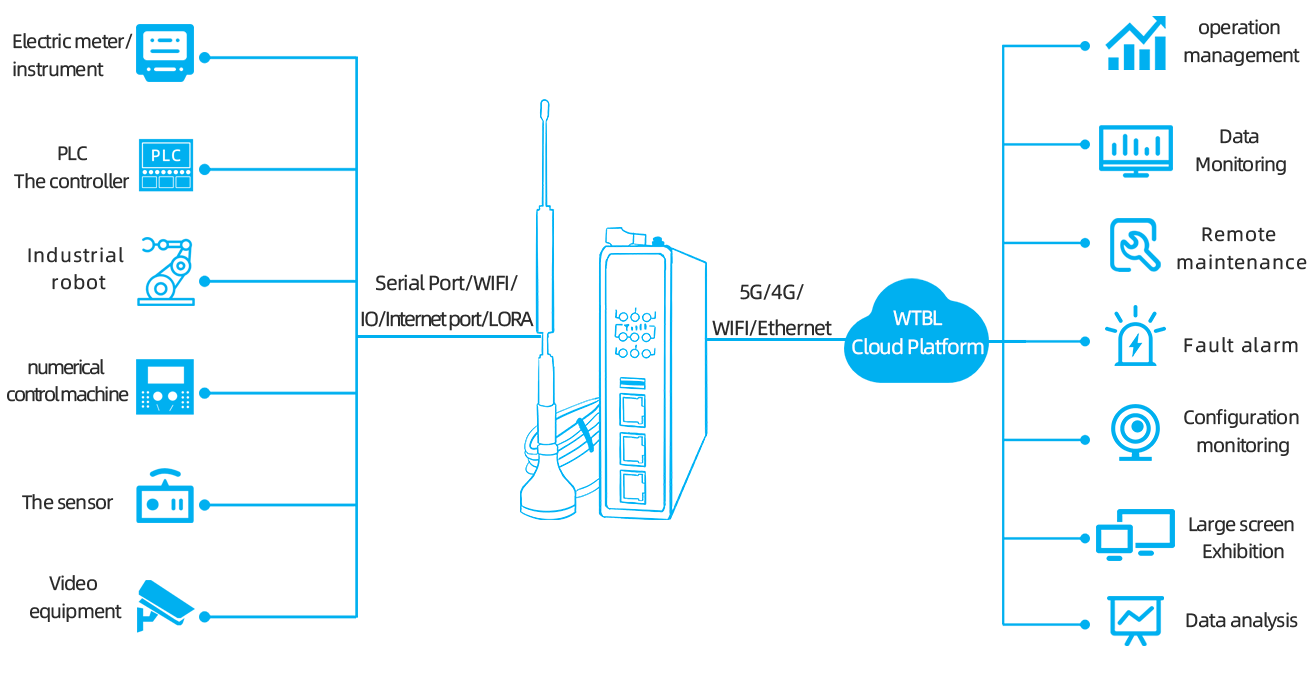 WideIOT · WG series industrial intelligent gateway is a high reliability industrial intelligent gateway that supports the collection of data of various industrial equipment such as PLC, instrument, water environmental protection, power equipment, CNC, and has protocol analysis and edge computing. It is the core edge node for building industrial Internet system.