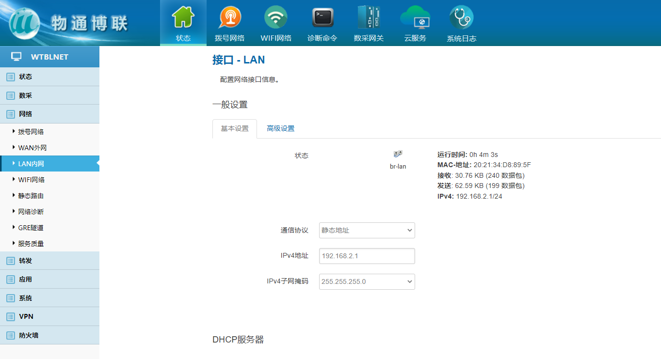 下载中心 视频中心 常见问题 售后服务 工业网关 设备快线 数据云平台 联网设备 问答百科 如何修改工业智能网关的LAN口IP地址? 时间:2022-10-26 09:06:09 点击:5032 关键词:工业智能网关,LAN口 问题:如何修改工业智能网关的LAN口IP地址? 回答: (1)电脑直连网关,确保电脑与网关处于同网段或者自动获取 浏览器里面输入192.168.2.1 (2)登陆网关配置界面 默认用户名/密码:admin/123456 (2)选择网络——Lan内网——更改IPV4地址、子网掩码,保存应用 (3)注意电脑本机IP地址是否与更改地址处于同网段(自动获取需重新拔 插网线) (4)浏览器输入更改后的IP地址登陆到网关配置界面即修改成功 上一篇:工业智能网关和DTU有什么区别吗? 下一篇: 工业智能网关需要另外配4G路由器吗?