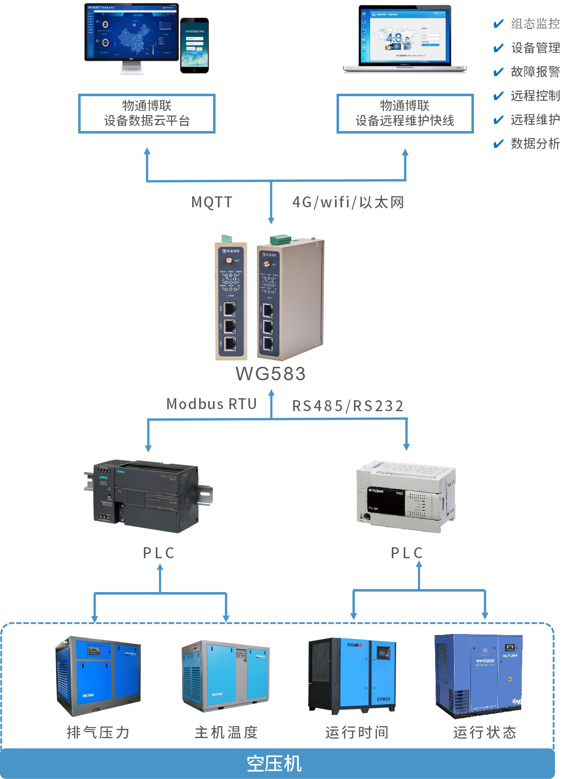 1、接入空压机并给予多种上网渠道,保证数据采集与实时传输