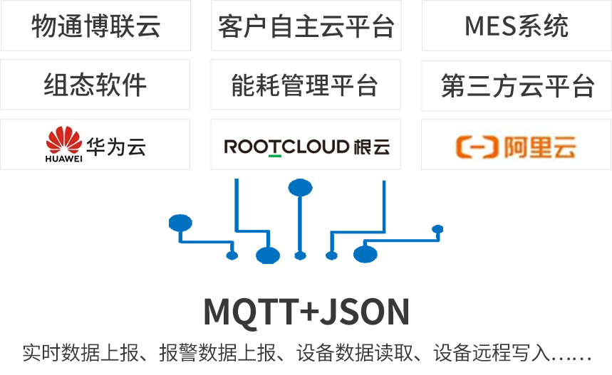 北向支持MQTT协议接入K8凯发(中国)云平台,客户自主开发的云平台,第三方云平台(根云、美云、华为、阿里、百度、微软等IOT云平台),组态软件、MES系统、ERP系统等工业软件