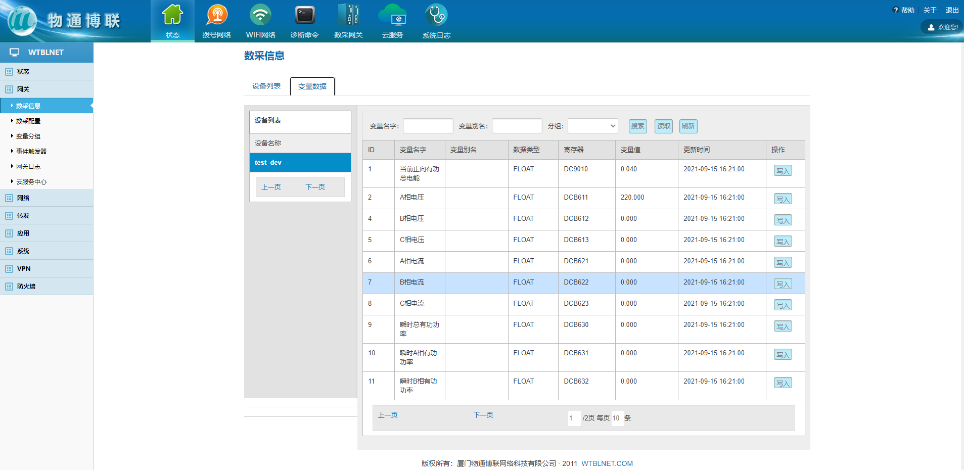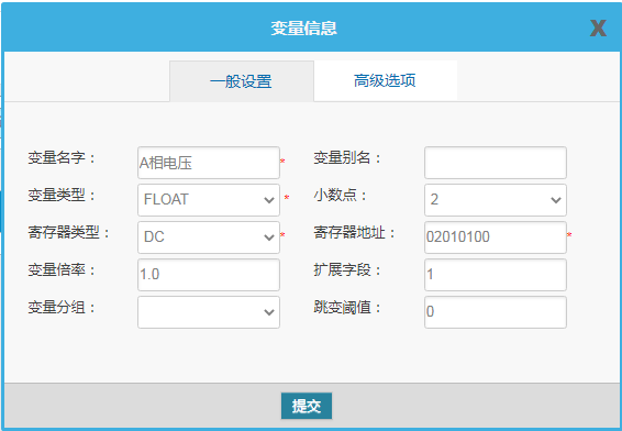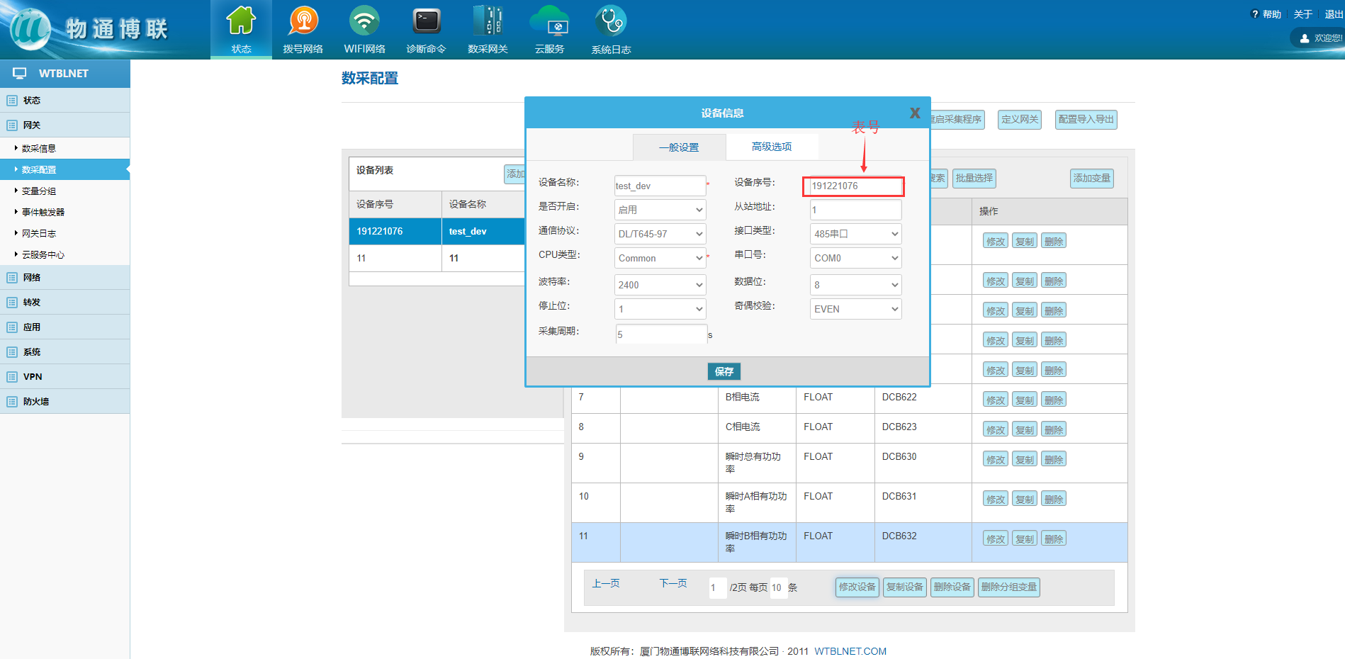 顺利获得产品说明书或者利用相应的产品配置软件,获取设备的串口参数(从站地址、串口号、波特率、数据位、停止位、奇偶校验)以及电表的表号,根据设备的接线类型在进行接线。1. 电表接线 电表的485线接到网关的com0口或者com1口,其中RX为A,TX为B。 2. 电表的表号获取 一般情况下,表号一般在电表上可见,如电表上没有表号一般可找对应厂家索要软件获取。 以下是某厂家给予的软件示例:  电表用USB转485串口接入电脑,打开电表配置工具进行获取参数 *请保证接线的正确,这个是调试设备最关键也是最基本条件。 2 网关配置 ☆ 打开浏览器登录网关配置界面,网关默认IP地址:192.168.2.1。 ☆ 网关LAN网口IP地址可登陆网关WEB管理界面:网络-LAN内网地址中修改。 ☆ 网关---数采配置---添加设备---添加变量---重启采集程序并生效新的配置。 1. 数采配置-设备配置 P.s.通常网关本地配置,仅作为测试用,先配置一部分变量来测试连通性即可,最终正常使用均在云平台进行配置。 配置信息:(配置协议、通信参数和采集周期)。  注:电表表号一定要填写,其他的根据电表的参数进行选择。 通讯协议选择: DL/T645-07 DL/T645-97 接口默认为COM0为485串口,WG581系列为COM1 其余的参数根据电表的设备的参数进行勾选!  高级配置内的设备扩展字段默认为0,如需调节静止时间(单位ms),输入0;0;0;XXX 2. 数采配置-变量配置变量配置主要是定义变量名(自定义内容,不可使用中文命名)、变量别名(自定义,可使用中文名字)、寄存器类型和寄存器偏移地址(请查阅对应支持的数据标识),并定义一些数据规则(如:倍率、小数点、单位、告警)  注:变量类型参数选择无效,主要根据寄存器地址来 寄存器类型:只有一种DC 寄存器地址:查表获取,比如DL/T645-07协议的A相电压,查表对应的数据标识是02010100,B相电表对应02010200。  3. 数据看板数采配置(设备信息+变量参数)完成后,重启采集程序并生效配置,即可在:数采信息---变量数据---设备名称 中看到采集上来的数据。  ☆ 采集的数据值为“NULL”,请核对数采配置中设备参数与变量参数信息是否和设备参数一致及接线的正常。 ☆ 采集的数据值不正确,请核对变量寄存器及其地址是否正确。 3 网关日志 1.修改日志调试等级 日志设置路径:网关---云服务中心---云接入调试等级与采集调试等级.为了保证网关快速高效采集,调试完毕后请务必将网关采集日志和云接入日志等级调整为信息。  2.云接入日志查看 云接入日志用于诊断接入到云平台的通信链路情况和数据报文情况。查阅路径:网关---网关日志—云接入日志。  3.采集日志查看 采集日志用于诊断网关采集现场设备的通信情况和报文收发情况、以及远程配置交互等情况。