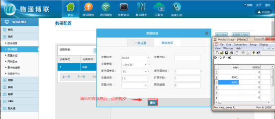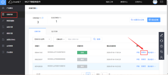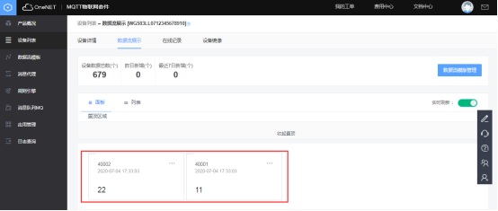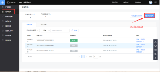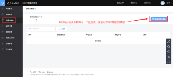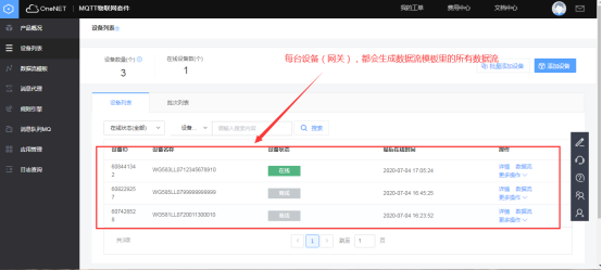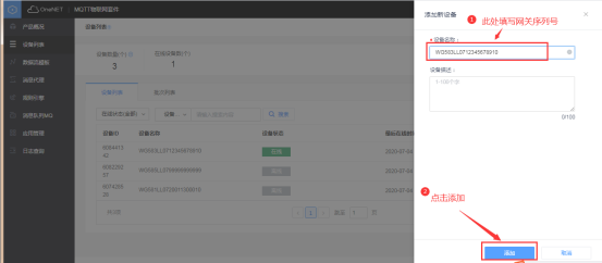 在全部产品中选择MQTT物联网套件(新版)  点击添加产品,根据实际情况自行填写  2、平台上添加网关(设备) 在目录栏中选择“设备列表”,然后点击添加设备  在设备名称中填写网关序列号  3、数据流模板(一般不需要) 可以添加数据流模板,假如该产品底下的网关都有同名称的数据流    4 网关采集数据上传平台 1、添加设备、变量 在网关中添加对应要采集的设备(plc,仪器仪表等,文档中用modbus slave软件模拟采集数据,模拟软件详细操作跳过,如果疑问可咨询)  所添加的设备、变量要与modbus slave参数一致    2、重启采集程序 设备和变量添加完毕后,要重启采集程序,使配置生效  确认网关有采集到对应的数据  3、数据在平台上展示 进入one net平台查看网关对应的数据流   5 平台对设备的反控 可以在设备列表中选择对应网关更多操作中的下发命令    *更详细步骤说明,可查看K8凯发(中国)操作手册文档或咨询K8凯发(中国)工程师