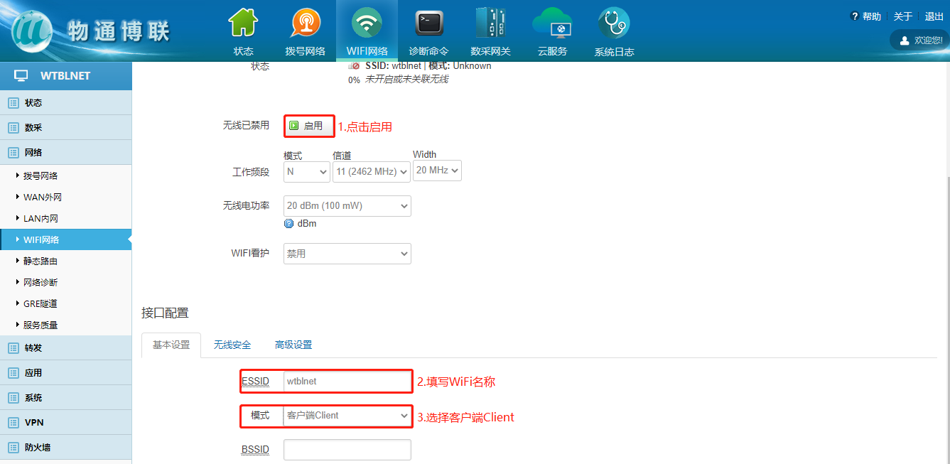 (4)启用WiFi—填写ESSID(WiFi名称)—模式选择客户端Client