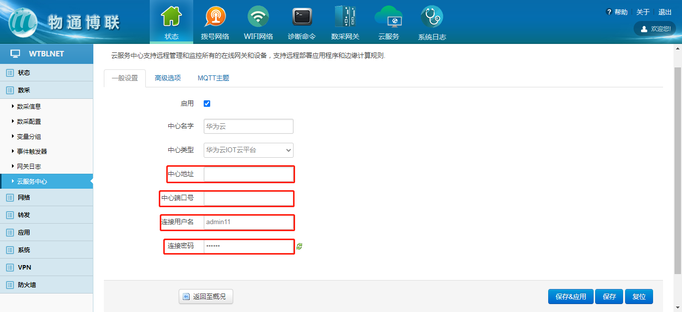 点击修改后进入中心配置界面,填写对应的MQTT连接参数;