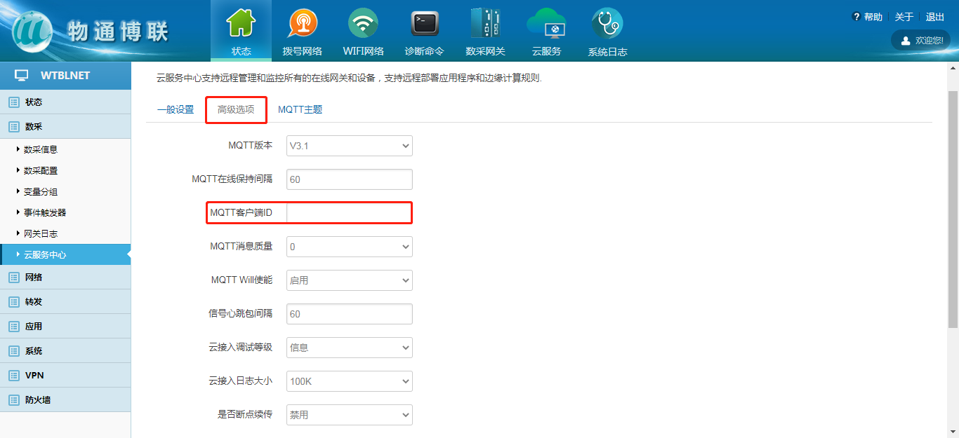 在高级选项中配置MQTT客户端ID连接参数,填写完毕后保存并应用; 在高级选项中配置MQTT客户端ID连接参数,填写完毕后保存并应用;