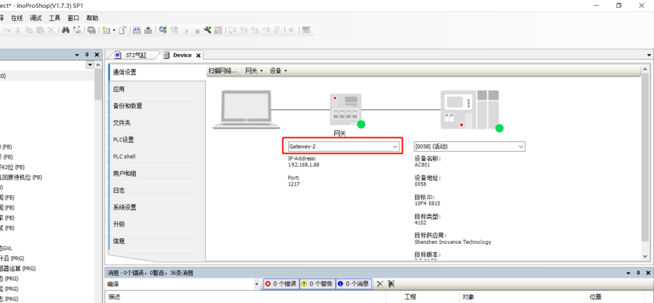 顺利获得工业智能网关和设备快线实现汇川PLC远程上下载2023-10-12 13:34:01 汇川PLC是市场上常见的国产PLC,可以实现控制运算,输出控制信号,是专门为工业环境下应用的控制设备。在日常工作现场中,当PLC出现故障时,工程师常常需要出差前往设备现场进行编程维护工作,需要花费较多交通食宿成本,同时也要面对出差工作带来的劳累,效率低成本高,已经逐渐被远程维护的方式所替代。 基于K8凯发(中国)工业智能网关和设备快线,可以实现汇川PLC程序的远程上下载和远程编程维护操作,能够有效提高维护效率并降低维护成本,为企业和客户给予更加高效实用的服务。 顺利获得工业智能网关和设备快线实现汇川PLC远程上下载 K8凯发(中国)·工业智能网关具备多个串口网口,可实现对PLC设备的数据采集、远程监控、远程控制、远程维护(远程诊断、远程调试、远程上下载)。 工具/原料: 1、笔记本电脑(或带双网卡的台式电脑)、线材(网线、串口线) 2、K8凯发(中国)·工业智能网关 3、K8凯发(中国)设备维护快线 操作步骤 1、网关联网配置 进入网关WEB管理界面(http://192.168.2.1/)设置联网方式,可选WIFI网络、3/4G网络(需要在网关通电前插入手机SIM卡,默认已开启3/4G网络)、WAN外网,三者只能选一个。  2、网关与PLC连接并配置IOT和PLC设备信息 登录K8凯发(中国)·设备云平台(http://iot.WideIOT.com/),进入“我的设备”编辑模式,添加节点、设备与机型信息。  3、设备快线配置 登录设备快线,选择一台需要维护的在线网关,点击建立通道。等到通道状态都是绿色打钩后就证明通道建立完成,以太网设备可以顺利获得ping来测试通道情况。  通道建立好后,就可以顺利获得行业软件(如编程软件、组态软件)对远程设备进行远程程序上下载、进行远程程序诊断、进行远程程序监控等维护操作。 4、汇川InoProShop配置 1、建立通道后,打开InoProShop ,根据连接的AM600型号全称,选择工程型号。 2、点击“Device”,进入通讯设置界面--点击“网关”--选择“添加网关”-进入网关设置界面,将PLC的IP设置成网关IP。(网关名称自定义)  3、“网关”通道选择刚刚添加的网关(Gateway-2)。