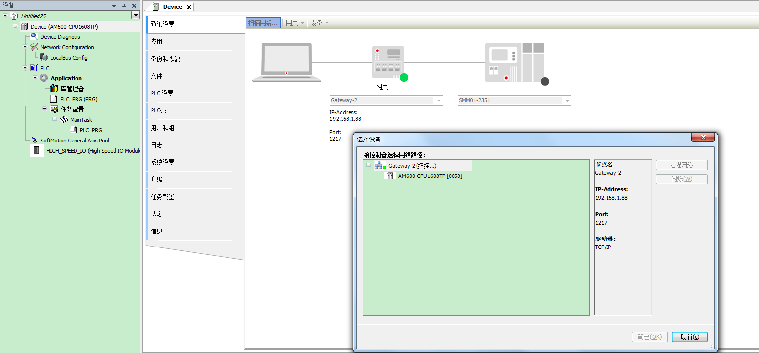 4、选择“扫描网络” ,选择扫描到的设备,点击“确定”,建立远程局域网通讯。  如上图所示,表示建立远程局域网通讯成功,可以开始进行远程监控PLC元件值、下载PLC工程等操作。 免责声明:本网站部分文章、图片等信息来源于网络,版权归原作者平台所有,仅用于学术分享,如不慎侵犯了你的权益,请联系我们,我们将做删除处理!