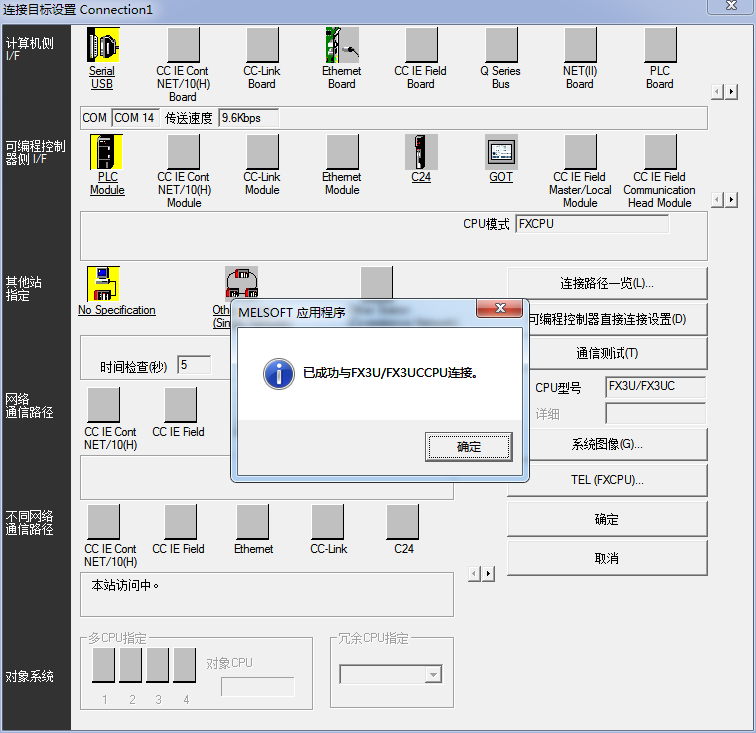 RS-232 通信接线 RS-485 通信接线 PLC 网关端 PLC 网关 线序 2 RX SDA、RDA 短接 RX + 线序 3 TX SDB、RDB 短接 TX - 线序 5 GND -------- 3、编程软件设置打开 MELSOFT系列 GX Works2,登录 FX3UPLC,设置 FX3U 串口参数,点击“在线”——“PLC读取”——“模块参数”,具体设置见下图: