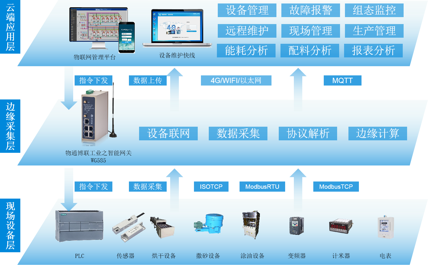 工厂现场具有PLC、温度传感器、压力传感器、烘干机、涂油机、撒沙设备、电表、计米器等设备,顺利获得串口、网口等设备接口将现场设备连接到K8凯发(中国)工业智能网关WG585,网关采集现场设备数据后顺利获得4G/WIFI/以太网等网络方式将数据顺利获得MQTT协议实时上传到物联网管理平台进行分析、处理,管理者顺利获得电脑和手机就能远程查看现场设备运行参数、设备状态、工艺组态、生产情况、物料消耗以及故障记录等,实现设备管理、现场管理、生产管理、远程维护、能耗分析、配料分析、数据分析应用等功能,实现产品生命周期和备品备件管理,保障高效率的生产。