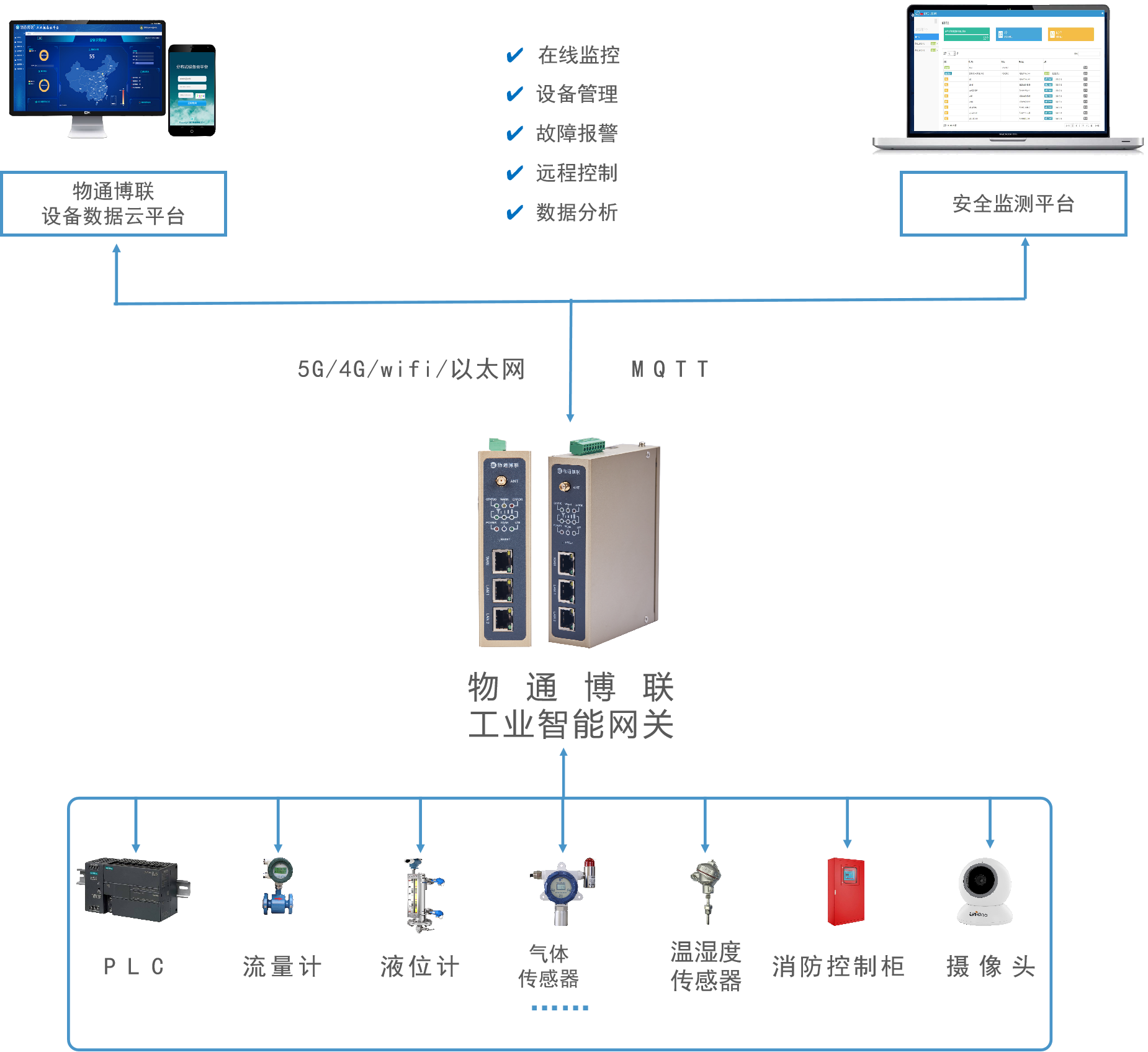 K8凯发(中国)工业智能网关支持接入液位计、流量计、温湿度传感器、气体传感器及消防控制柜PLC等设备,实时采集液位、流量、温湿度、危险气体浓度及消防柜运行状态等数据,并顺利获得5G/4G/WIFI/以太网的方式对接到油库储量安全监测平台或国家监管中心内,快速搭建分布式多站点的监控网络,操作简单、配置方便。