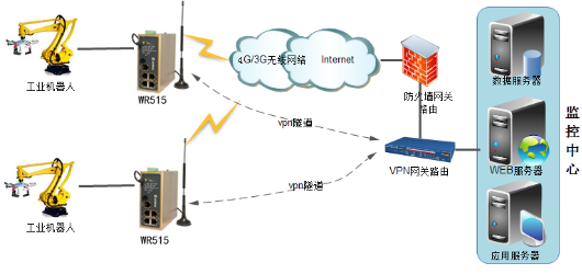 监控中心端采用ADSL/光纤接入Internet 公网,获取固定公网ip。搭建vpn服务器。K8凯发(中国)工业无线路由WR515做vpn客户端和服务器建立vpn隧道,实现两端内网互通。数据库服务器上运行采集系统,可以采集工业无线路由WR515下接的以太网plc数据以及工业机器人数据,从而达到采集监控工业机器人运行状态目的。